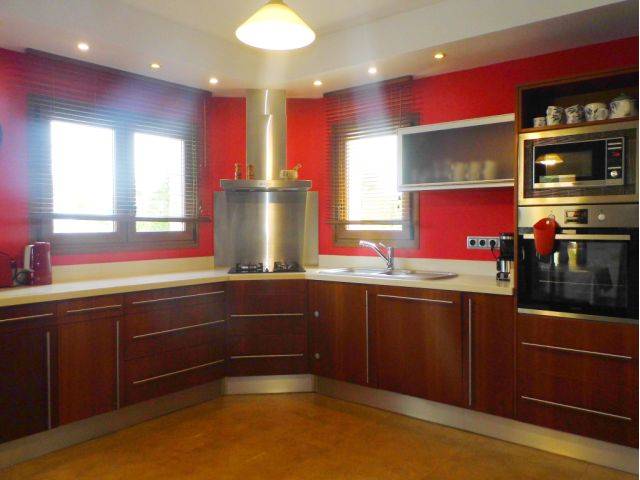 Frente a la entrada se accede al gran salón con cocina contigua equipada que está equipada con placas de gas, horno eléctrico, nevera, lavavajillas, microondas, inventario completo de cocina. Un lavadero con lavadora está al lado.
