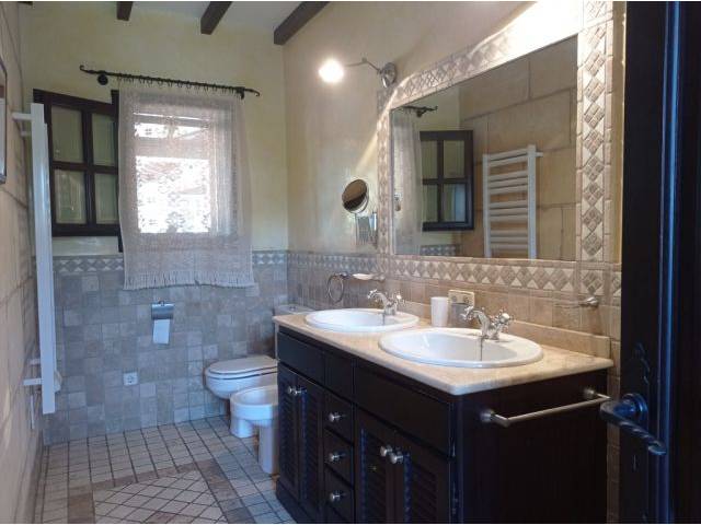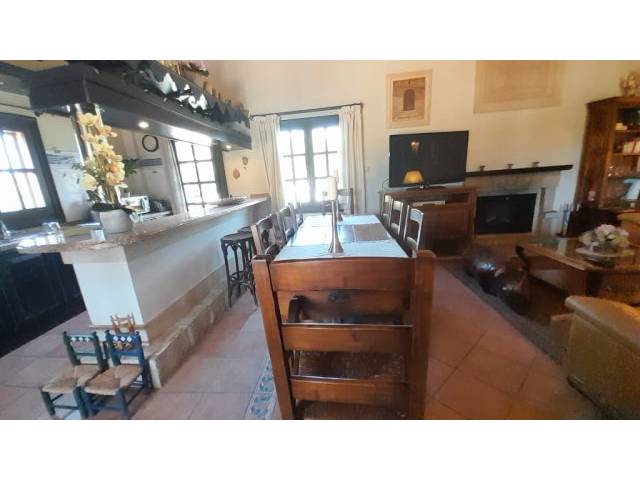Equipamiento de la casa principal: Suelos de baldosas rústicas y de color crema, persa de madera verde oscuro, paredes exteriores de piedra natural de aprox. 50 cm que contribuyen a un buen clima de vida, doble acristalamiento, puertas y ventanas de teca de Teca, agua de pozo de buena calidad y agua de ciudad para la casa (con asa para cambiar) y también agua de cisterna de ciudad para el jardín, agua caliente a través de una caldera eléctrica de 150 l, filtro de ósmosis de agua potable en la cocina, Habitaciones luminosas TV SAT y antena de TV Española, línea de internet vía Conecta Balear de 100 MB, 5 x AC (frío – calor), chimenea cerrada.