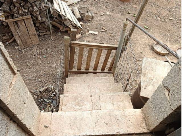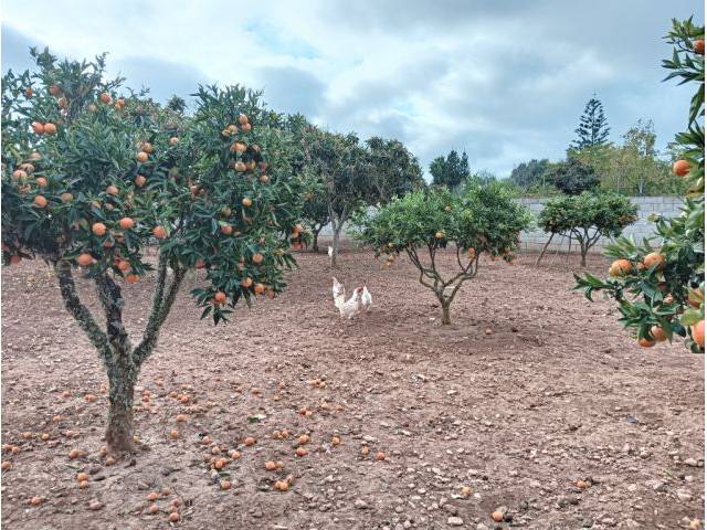 El terreno terroso y llano tiene árboles frutales, un aljibe de agua de lluvia con motor y el garaje tiene una bodega adicional de unos 20 m2.