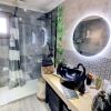 Baño: baño de diseño moderno con ducha de cristal y elegante travertino