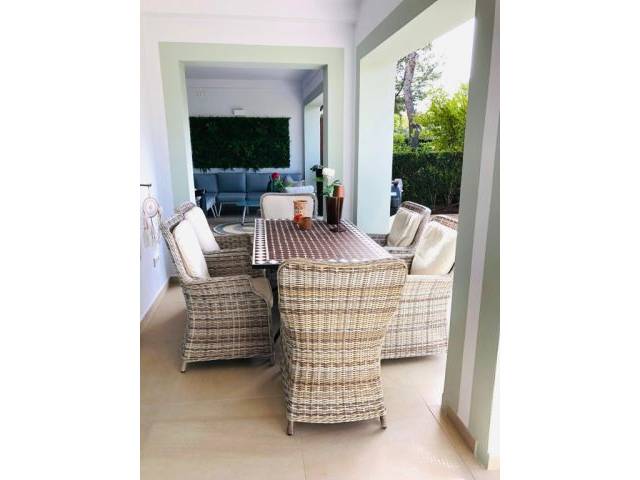 La zona de jardín privada con una gran terraza de aprox. 40 m² está cubierta y amueblada cómodamente con mesa de comedor y zona de lounge, absolutamente especial. Además, la zona de jardín privada es mantenida de forma regular y rutinaria por los jardineros de la urbanización de fantástico crecimiento y se mantiene en estado TOP.