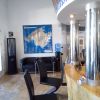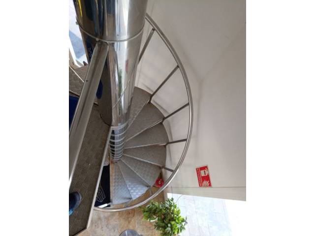 La oficina es un atractivo con grandes vitrinas iluminadas, mucha superficie acristalada y 2 grandes entradas. En la zona de recepción hay un gran mostrador de mármol y una escalera empotrada de acero inoxidable.