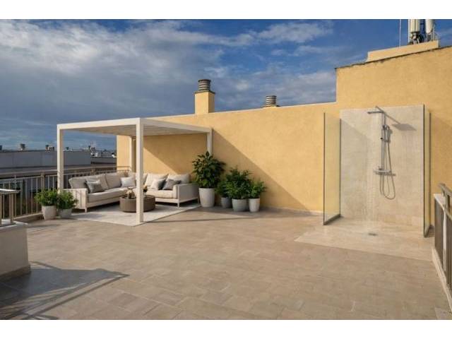 Un aspecto destacado de esta propiedad son las dos terrazas privadas en la azotea con un total de aprox. 150 m² de superficie, que se extienden en dos niveles. La terraza inferior de la azotea es completamente íntima y ofrece máxima privacidad. La terraza superior dispone de una ducha exterior y una vista parcialmente ampliada. Ambas terrazas cuentan con una plantación inicial y reciben sol durante todo el día, condiciones ideales para tumbonas, zonas lounge, comidas al aire libre o veladas relajadas bajo el cielo abierto. El piso está equipado con aire acondicionado (frío/calor) en todas las habitaciones y dormitorios, que también cumple la función de calefacción. Además, los radiadores en los baños proporcionan una comodidad agradable.