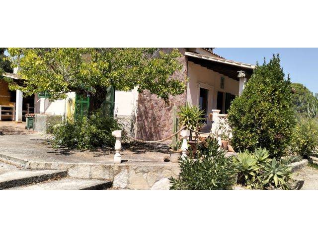 En medio del hermoso paisaje de Sant Joan se encuentra a la venta esta idílica finca rústica de 14.144 m² en una ubicación absolutamente tranquila y aislada. Incluye una casa unifamiliar de 80 m² con dos dormitorios y un baño, un salón con chimenea, una cocina separada y una veranda de 24 m². Adyacente hay un apartamento de aprox. 24 m² (antiguamente garaje) con un dormitorio y un baño en la planta baja. La superficie habitable total, incluida la veranda, es de 104 m².