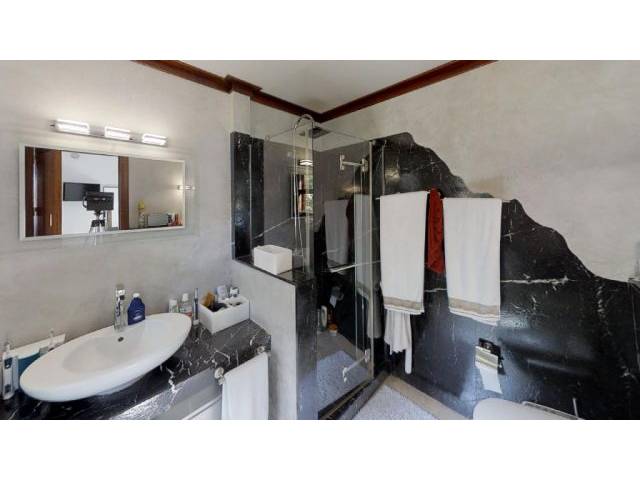 – las paredes son de perlita eceptuando en cocina que es de estuco, así como en los baños que también es de estuco combinado con mármoles menos el principal que se combina con madera y marmol negro con betas blancas.