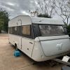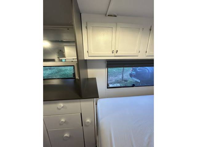 Sin cabina húmeda. Hay un inodoro de camping bajo el banco en ruedas. Ducha de camping para exterior con calentador de agua a gas instantáneo.