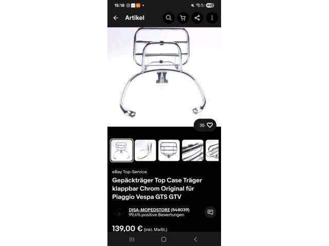 Ofrezco un portaequipajes trasero original para Vespa GTS 300, como se ve en las fotos. Tiene marcas de uso, pero se pueden quitar con poco esfuerzo. ¡Si estás interesado, ponte en contacto!