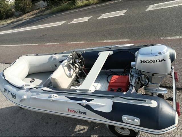 se vende un bote inflable Honwave con un motor fueraborda Honda de 30 hp de 4 tiempos. con puesto de gobierno y asiento de banco especial