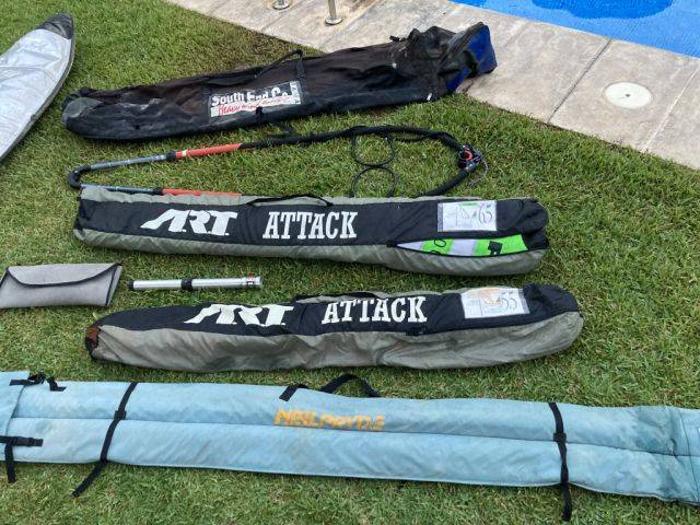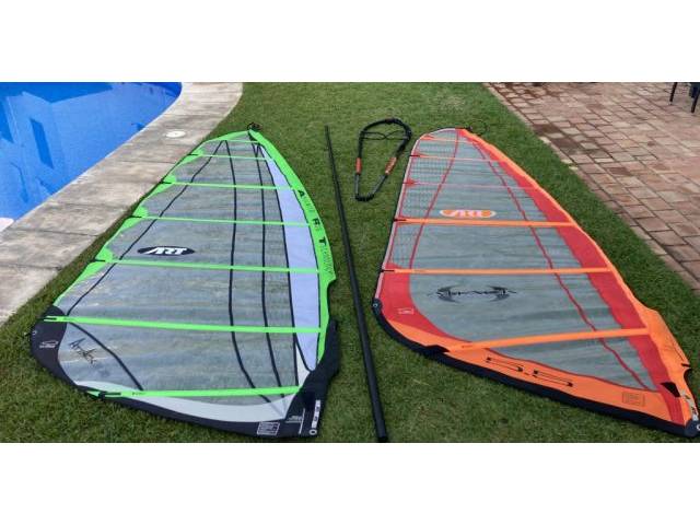 Vendo mi paquete de vela de windsurf ART Attack que consta de 2 velas, roja de 5,5 m2 y verde de 6,5 m2 debido a la tarea deportiva. Los accesorios incluyen una botavara PowerBoom de 165-210 cm, un mástil de 2 partes, una extensión de mástil Tarifa B3 Canarias y una base de mástil
