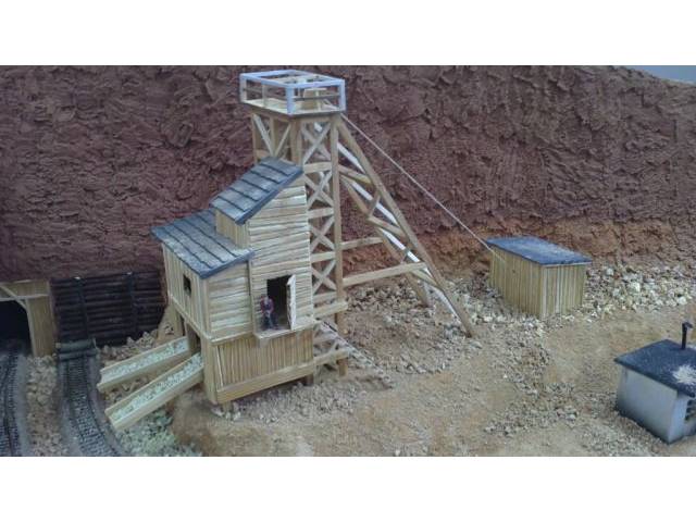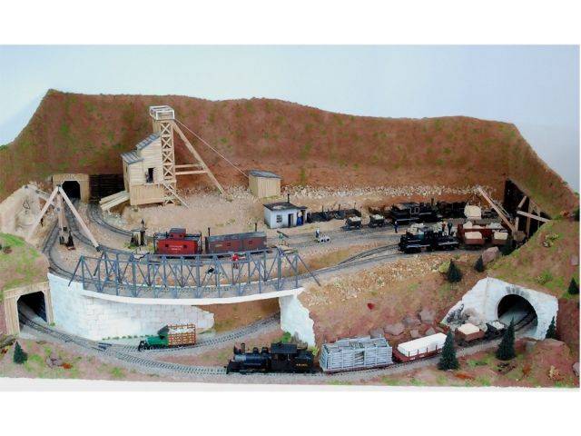 La maqueta representa una mina de mineral estadounidense con cantera y estación de carga alrededor de 1900.