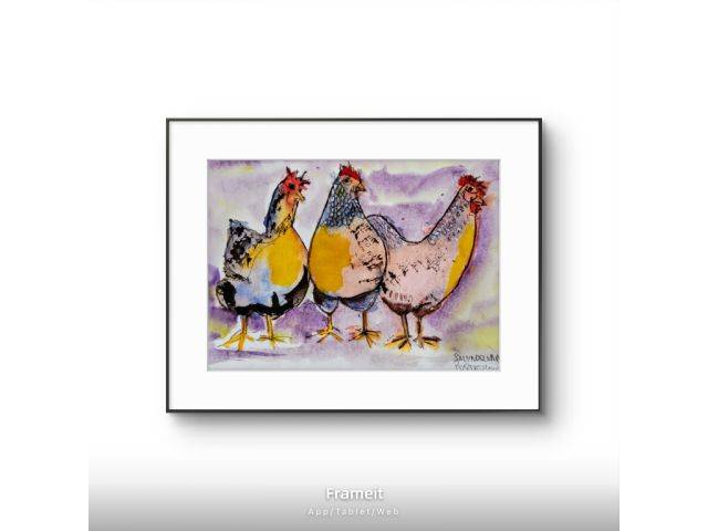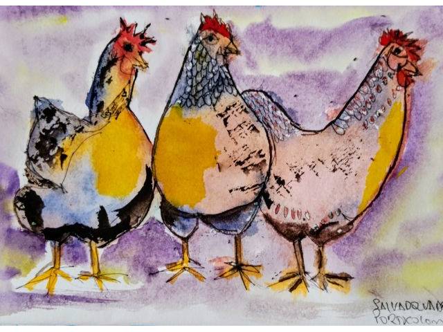 Preciosa acuarela de tres gallinas ,una acuarela única