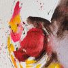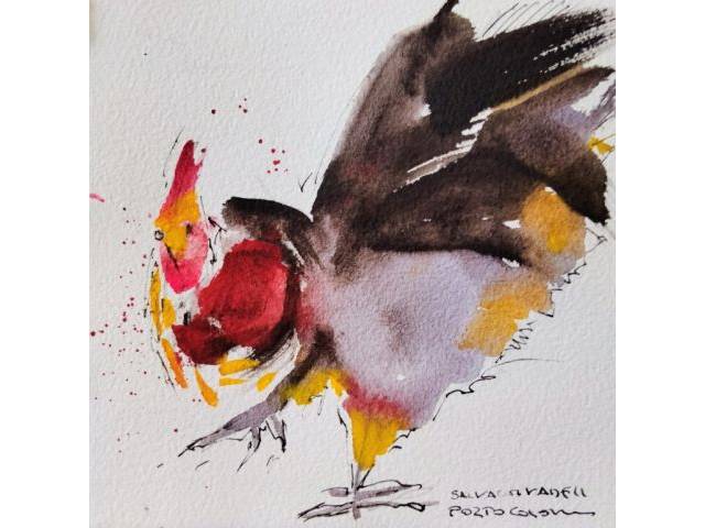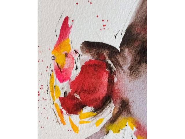 Preciosa acuarela de un gallo,en rojos negros y amarillos