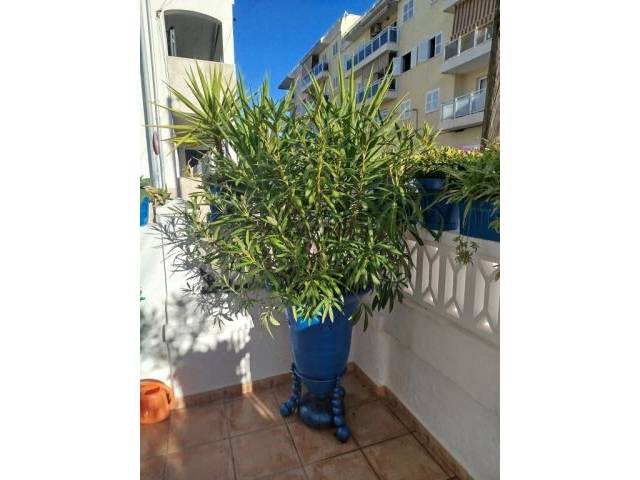 La ánfora está plantada con dos arbustos de adelfa - compuestos cada uno por 4 brotes - en color blanco y una gran palma de yuca con un tronco. (Durante la última tormenta se rompió un tronco - en la foto todavía hay dos)