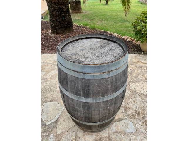 En venta una bonita barrica de vino usada de madera con aros metálicos. La barrica destaca por su pátina auténtica y natural y aporta un fragmento de la tradición vinícola a la casa o el jardín.