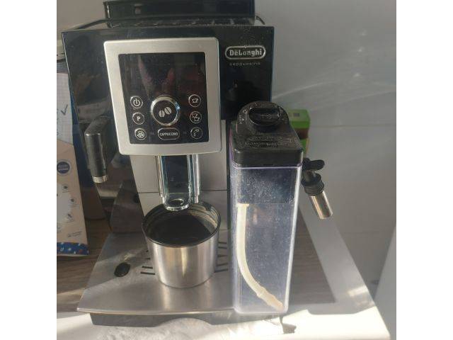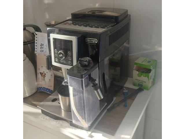 Esta cafetera superautomática ha sido utilizada hasta ahora y funciona perfectamente. Se ha descalcificado y limpiado regularmente. Cuenta con un depósito de leche para poder preparar cappuccinos. Un punto de agua caliente para la preparación de té también forma parte del aparato. Hay dos contenedores de café, uno para granos enteros y otro para café molido. Varias opciones de ajuste garantizan un exclusivo disfrute del café. Se incluye una botella de descalcificador para 5 descalcificaciones. El aparato se puede recoger en Santanyi.
