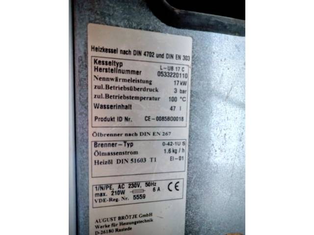 Caldera de gasóleo 17 kW Brötje completa con depósito de combustible, chimenea de acero inoxidable y todos los accesorios. Vendo una caldera de gasóleo usada de la marca Brötje (marca alemana) completa con depósito de 1500 ltr., chimenea de acero inoxidable, tuberías, bombas, etc. La instalación está totalmente funcional y actualmente aún en funcionamiento. Manual de montaje y de funcionamiento disponible. Venta por cambio a bomba de calor. Las fotos sirven para la descripción. Visita, compra y recogida en Cala Pi cerca de Llucmajor. Venta mediante oferta.