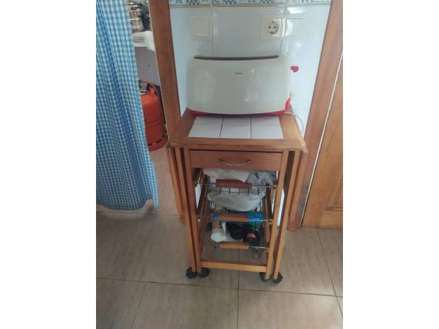 Carrito de cocina de madera con encimera de azulejos y estantes de almacenamiento