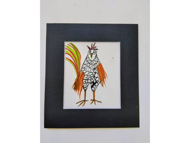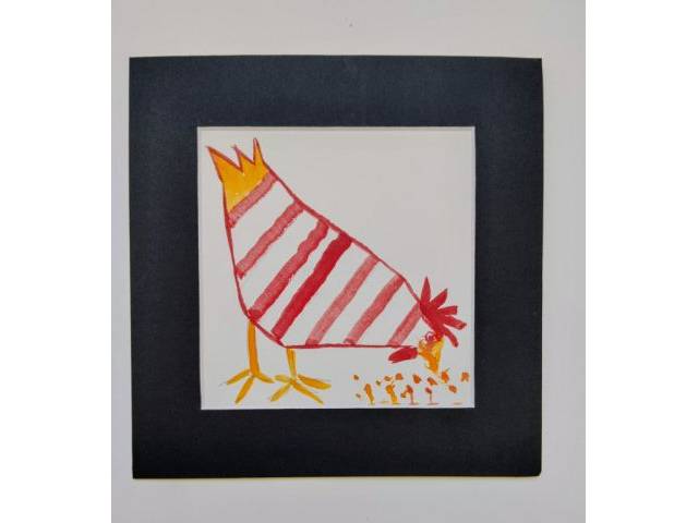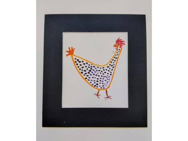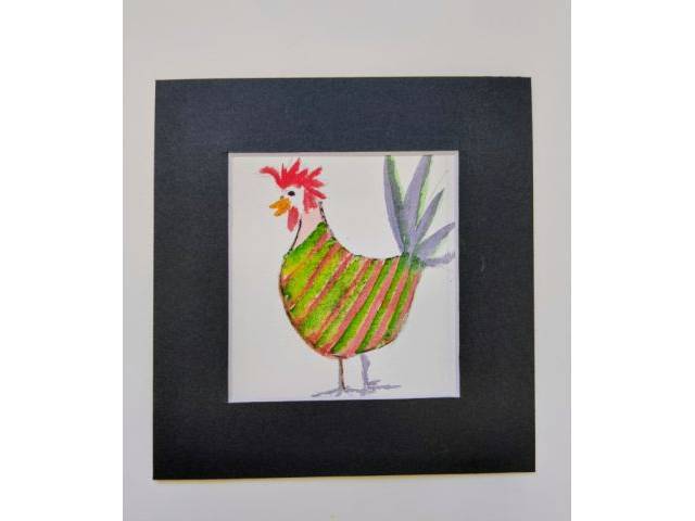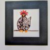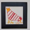 Conjunto de cinco gallinas infantiles con paspartout negro ,originales para decorar un rincón de juegos o habitación de niños