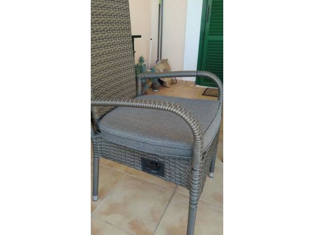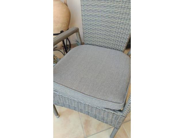 Vende aquí cuatro nuevos cojines de asiento también para exteriores. Comprado nuevo en JYSK en Manacor hace unas semanas. Color: Arena oscuro - marrón. Dimensiones: 48x49x6 cm. Precio original ver página de inicio 79,96 euros. Nuestro juego va a desaparecer y desafortunadamente no caben en las nuevas sillas. Hogar para no fumadores sin mascotas en