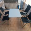 4 sillas, dos de ellas con respaldos ajustables. La mesa y las sillas se pueden plegar para ahorrar espacio.