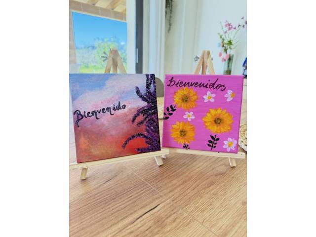 pinto pequeños cuadros de bienvenida pintados a mano sobre lienzo con flores en estilo mediterráneo.