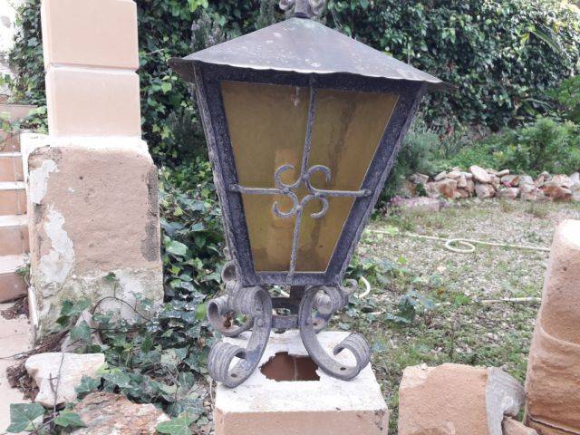 Hermosa lámpara de jardín macizo de hierro forjado antiguo con Patina.Ca. 40 años. Altura aprox. 60cm - ancho por encima de aprox. 40cm. Ubicación/colección Cala Dor tfl 666 944 124