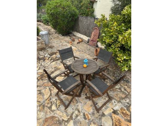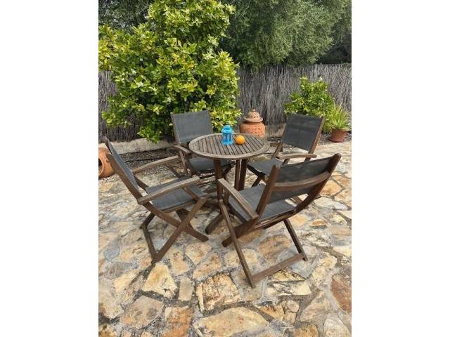 Hermosa mesa redonda de madera para equipos con 4 sillas
