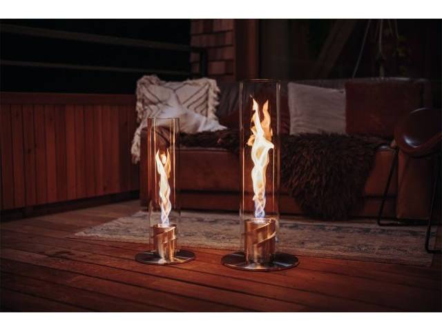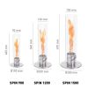 Resuelta, llena de energía y al mismo tiempo suave y fluida, la llama SPIN se eleva en el aire y se extiende por toda la longitud del cilindro de vidrio. El SPIN impresiona por su tamaño y calidez y es el fuego de pie perfecto para su balcón o terraza, pero también para su sala de estar o mesa de comedor.