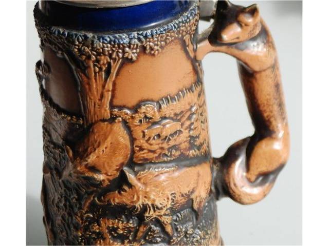 Jarra de cerveza Gerz original, tapa de peltre, motivo de zorro de caza