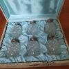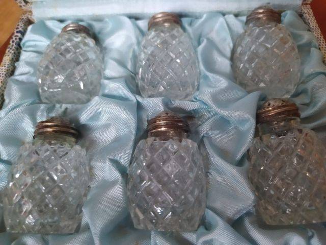 Juego de 6 saleros y pimenteros de cristal con tapas de plata.