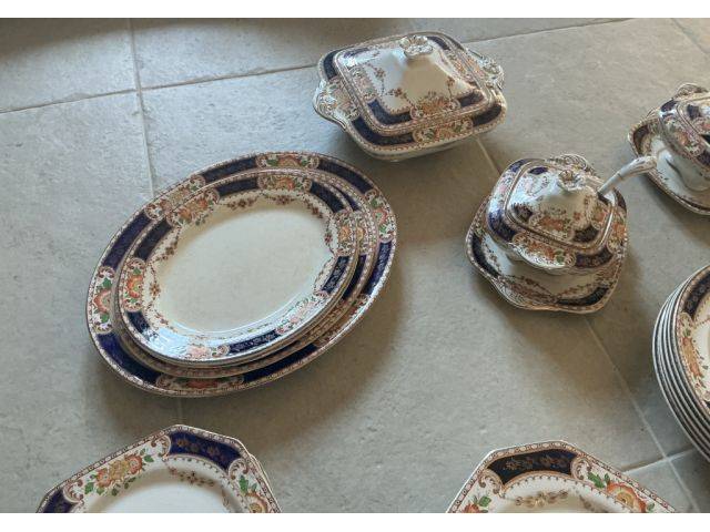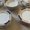 Juego de vajilla inglés antiguo de Stratford/ England, platos de postre, platos llanos en varias variantes, platos de sopa, cuencos y cuatro bandejas de distintos tamaños.