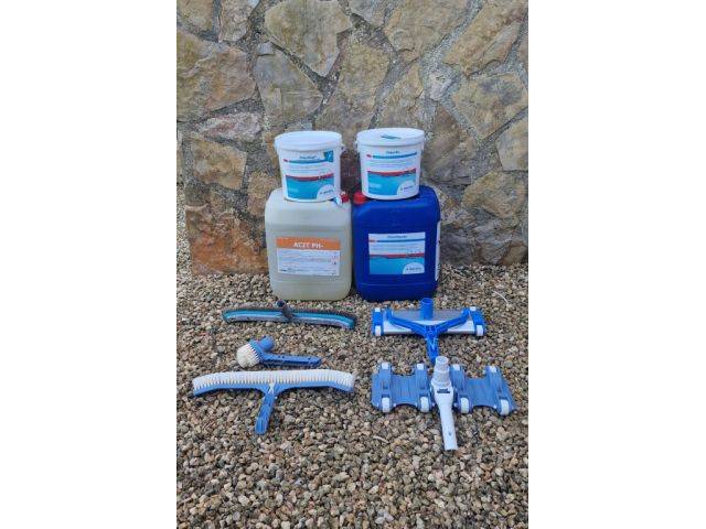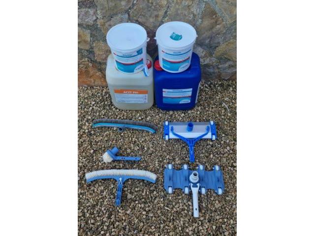 Set de limpieza de piscina, limpieza de piscina, productos químicos para piscina usados, en buen estado
