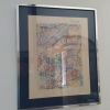 El marco es de color plateado o metálico, y rodea un paspartú de color azul oscuro. La obra en sí es una composición abstracta. Presenta un patrón intrincado de formas orgánicas