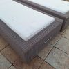 Las tumbonas son de segunda mano y presentan marcas normales de uso. Aviso importante: en las esquinas (ver fotos) el tejido de polyrattan está ligeramente dañado. Esto es solo un defecto estético y no afecta en absoluto al disfrute de las tumbonas: ¡están estructuralmente estables y son funcionales!