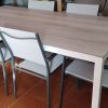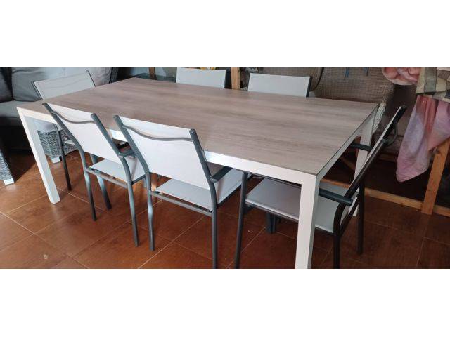 Mesa aluminio y base imitación madera con 6 sillones aluminio nuevos sin uso.