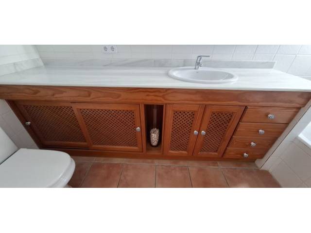 Mueble de baño en buen estado con encimera de mármol gris claro y lavabo roca (sin grifo)