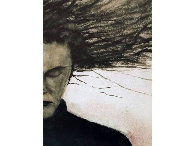 Preciosa acuarela de una mujer melancòlica con los cabellos al viento
