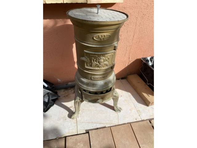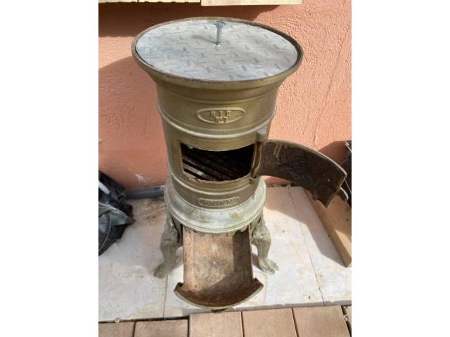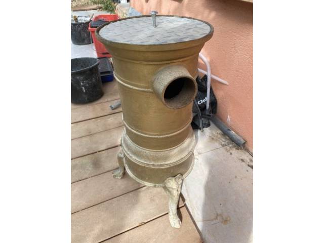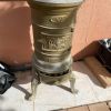 La estufa tiene una altura de 65 cm. Salida de tubo de 100 mm. 3 patas. Acabado en color latón. Tapa superior no original. Recogida en 07240 Sant Joan.
