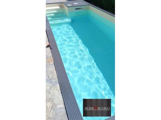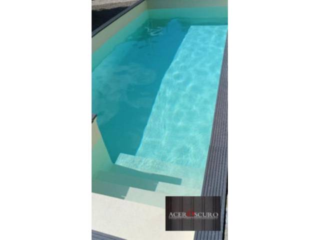 Containerpool (pieza de exposición, ahora solo 19.900 euros / precio de lista 23.500 euros). La piscina cuenta con una escalera integrada, una sala técnica con acceso lateral, dosificación de pH, regulación automática del nivel del agua, sistema de agua salada e iluminación en la piscina. El interior está revestido con RENOLIT LINER Sand. El color exterior es beige; sin embargo, puede repintarse por un suplemento. Disponibilidad a partir de aprox. mediados/finales de noviembre. Es posible la entrega. AcerOscuro módulo casa Mallorca
