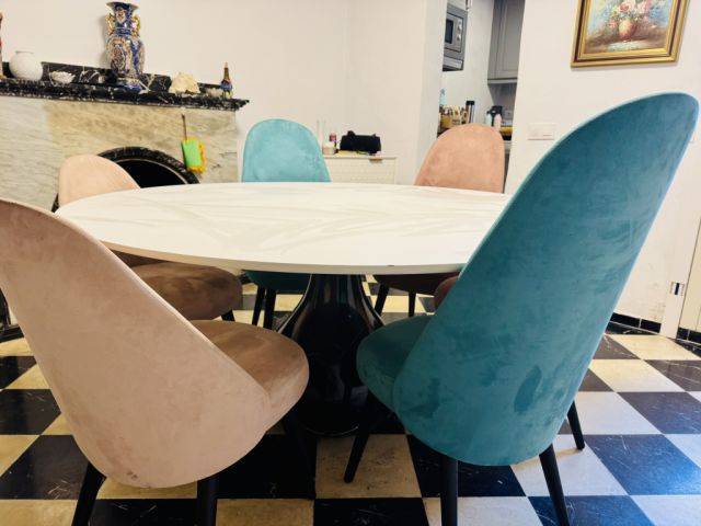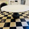 Mesa de comedor redonda con base central en mármol macizo con brillo mate o pulido y tapa en poliuretano lacado y tapa de MDF con revestimiento Fenix. Fabricado en Europa.