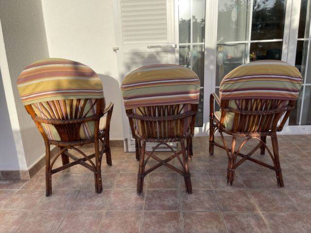 6 sillas de jardín con 4 cojines disponibles, mesa redonda a juego