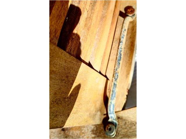 La madera que se ve en las imágenes presenta una típica pátina gris plateada que se forma cuando la teca queda expuesta a la intemperie sin tratar. A quien no le guste la pátina, puede eliminarla con un decapante para teca o lijando ligeramente para recuperar un tono dorado cálido.