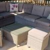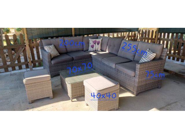 Sofá jardín rinconera de rattan sintético , mesa y puff. con cojines en gris.