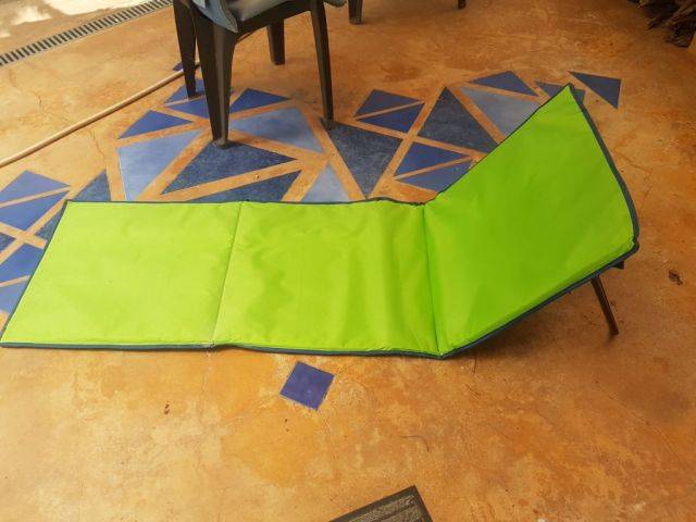 Cojín verde, plano, ligeramente acolchado con respaldo, para que puedas apoyarte, precio 15,-