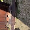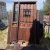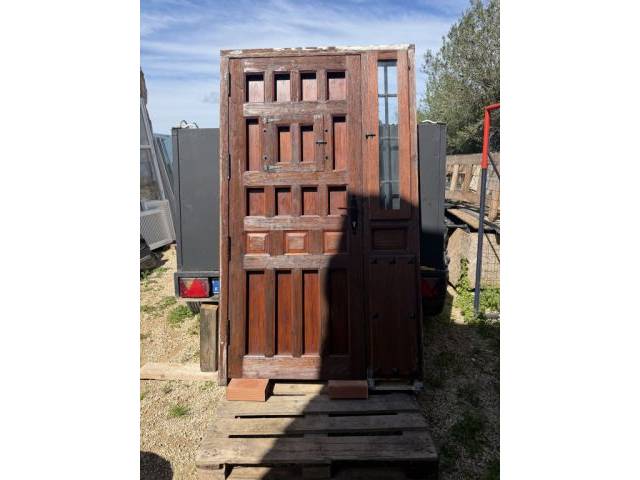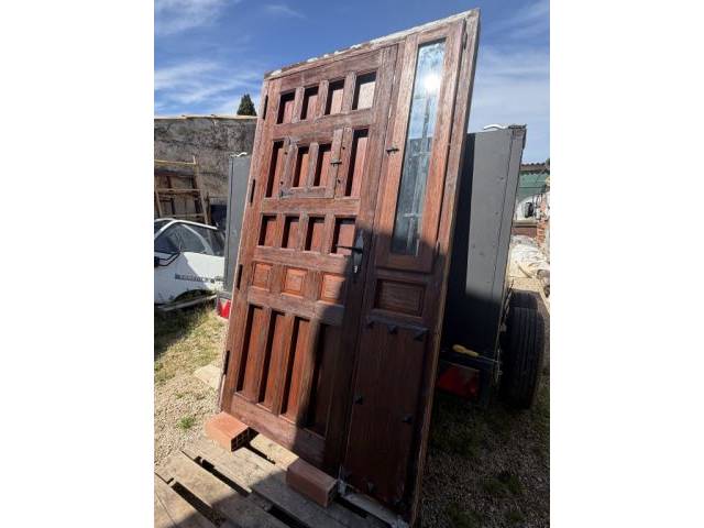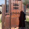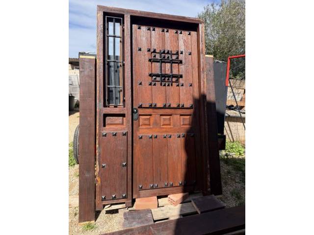 Puerta rústica de madera con un diseño tradicional y detalles metálicos.