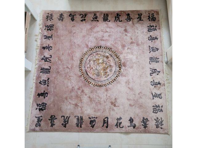 Bonita alfombra cuadrada, aprox. 2,00 x 2,00 m, decoración china, lana, pelo tupido, tono cálido, usada pero en buen estado.
