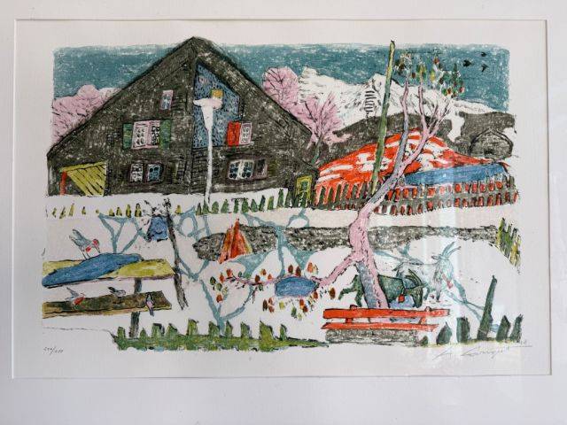 A la venta está una gráfica original, firmada a mano, del famoso artista suizo Alois Carigiet (1902–1985). Carigiet es uno de los más importantes grabadores suizos del siglo XX, conocido internacionalmente por sus ilustraciones y sus escenas alpinas de colores intensos.
