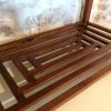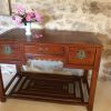 ... con reposapiés de rejilla y 3 cajones. Buen estado. Medidas: 116 cm de ancho, 60 cm de profundidad, 83,5 cm de alto. Probablemente fabricado en el siglo XIX con madera de olmo.