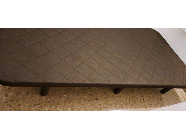 Base de cama tapizada con tejido antideslizante, patas desmontadas por traslado. Sin colchón. No tengo disponibilidad de transporte