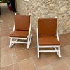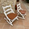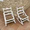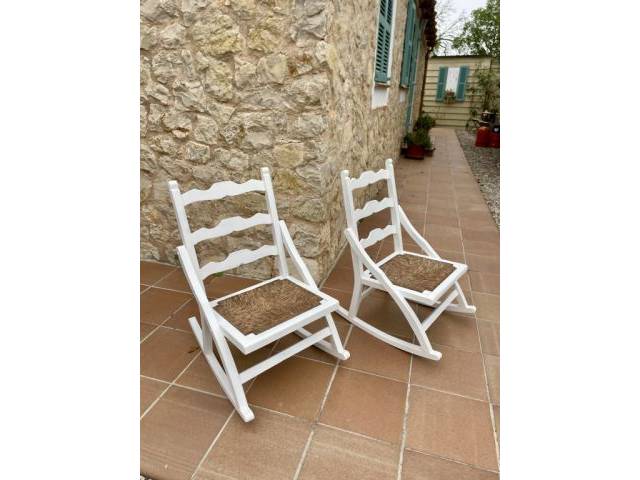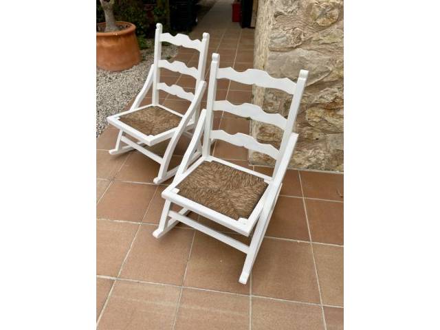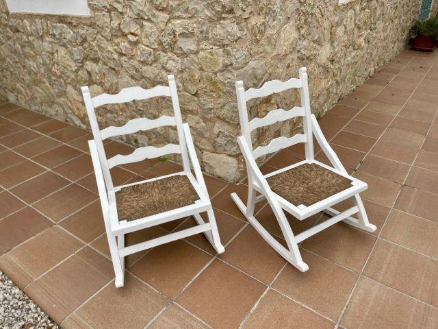 Vendo dos estupendas mecedoras antiguas de madera. Pintadas en blanco mate con asiento de bast. Además, hay cojines de asiento marrones a juego. ¡Seguro que quedan genial en una finca o en una casa de pueblo! Dimensiones aprox. 50x40x80 cm.